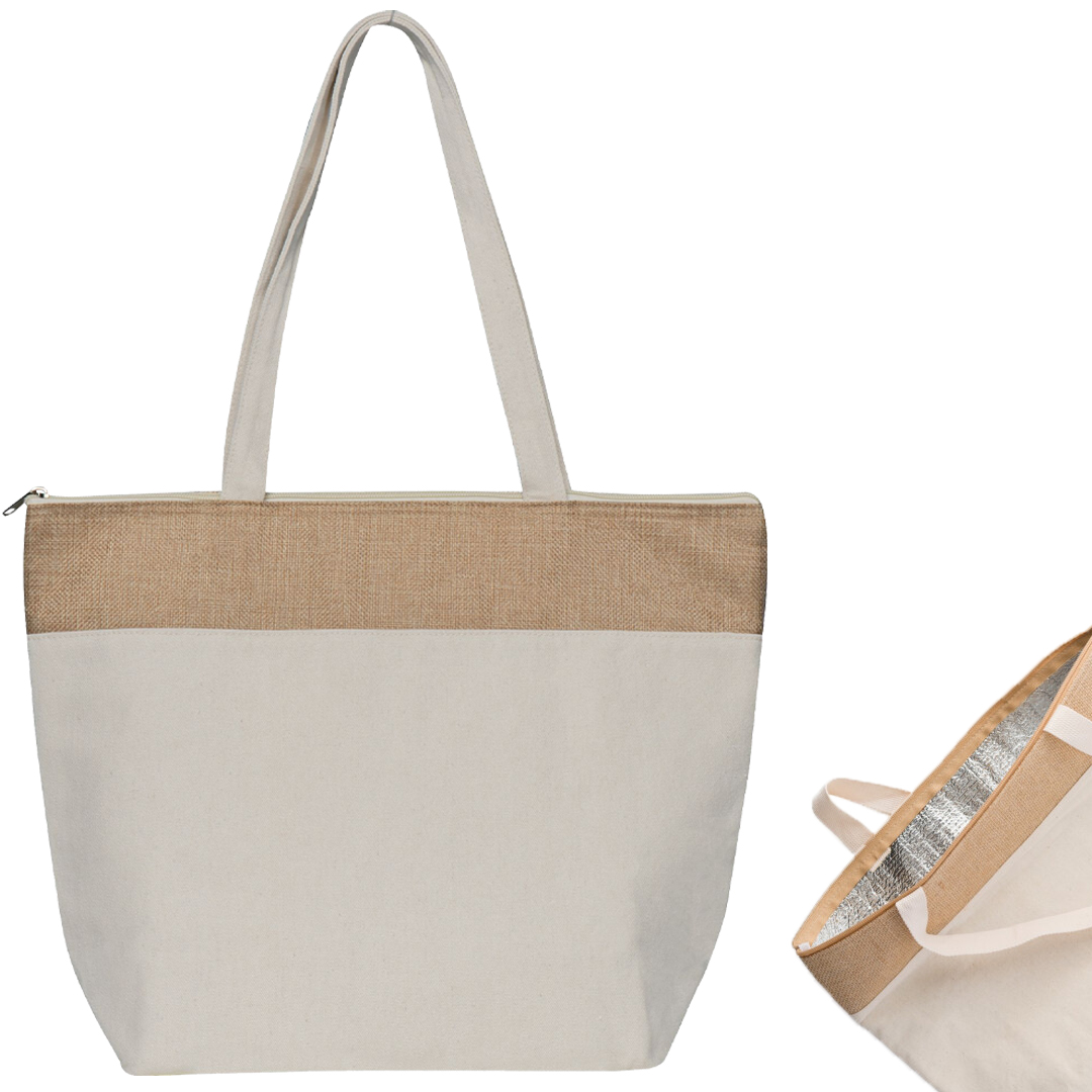 A versatile and sustainable solution for keeping your items chilled while on the move. This bag is crafted from a blend of cotton and jute, offering durability and eco-friendliness in one stylish package.